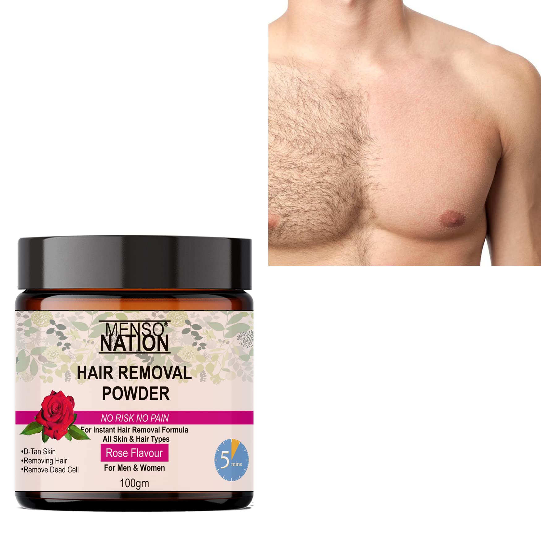Mensonation Hair Removal Powder for removing Hairs & D Tanning for Legs Forearms Chest Back ROSE Fragrance 100 Gms (200)