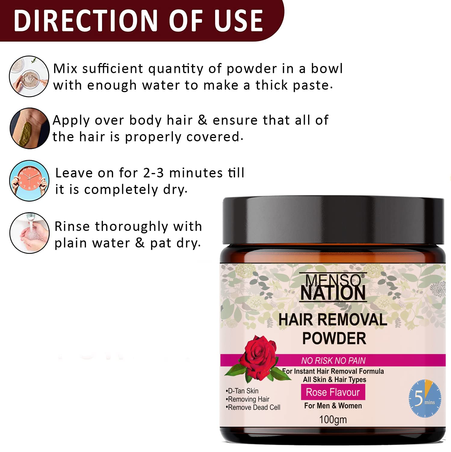 • Application: Just mix this hair removal powder with water to make a paste and apply on desired area for maximum 6-8 minutes and wipe with a damp cloth upward with bit firm hands