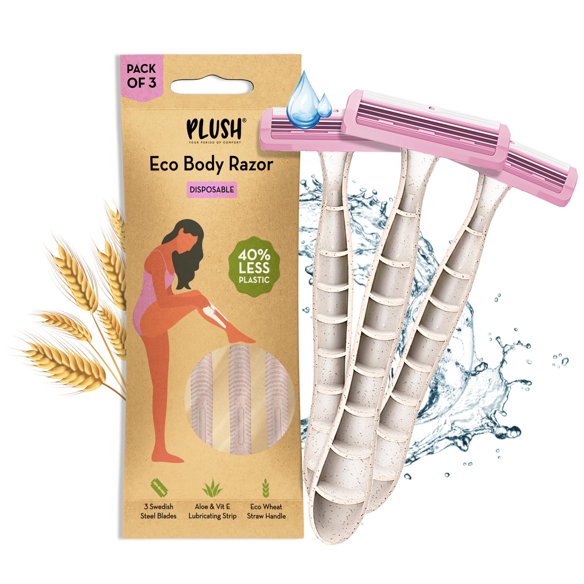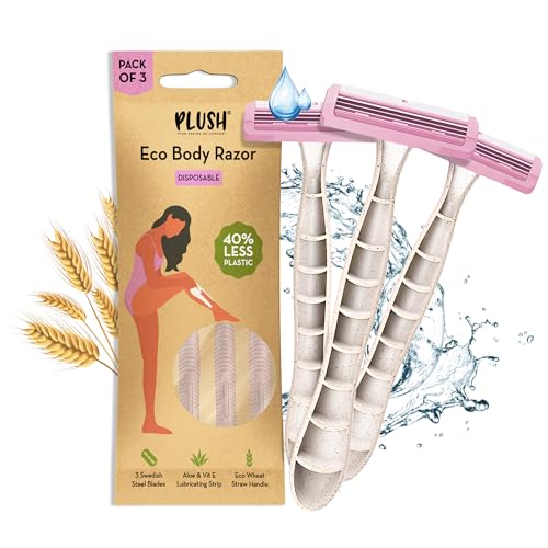 Plush Eco Disposable Body Razor for Women 3pc | Aloe & Vitamin E Lubricating Strip & Wheat Straw Handle | Irritation-Free Hair Removal with Swedish Steel 3 Blade Razor for Smooth Shave