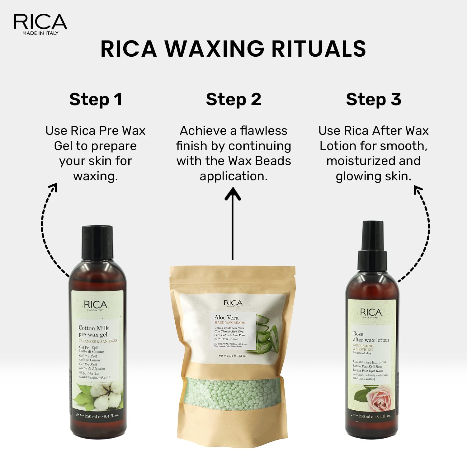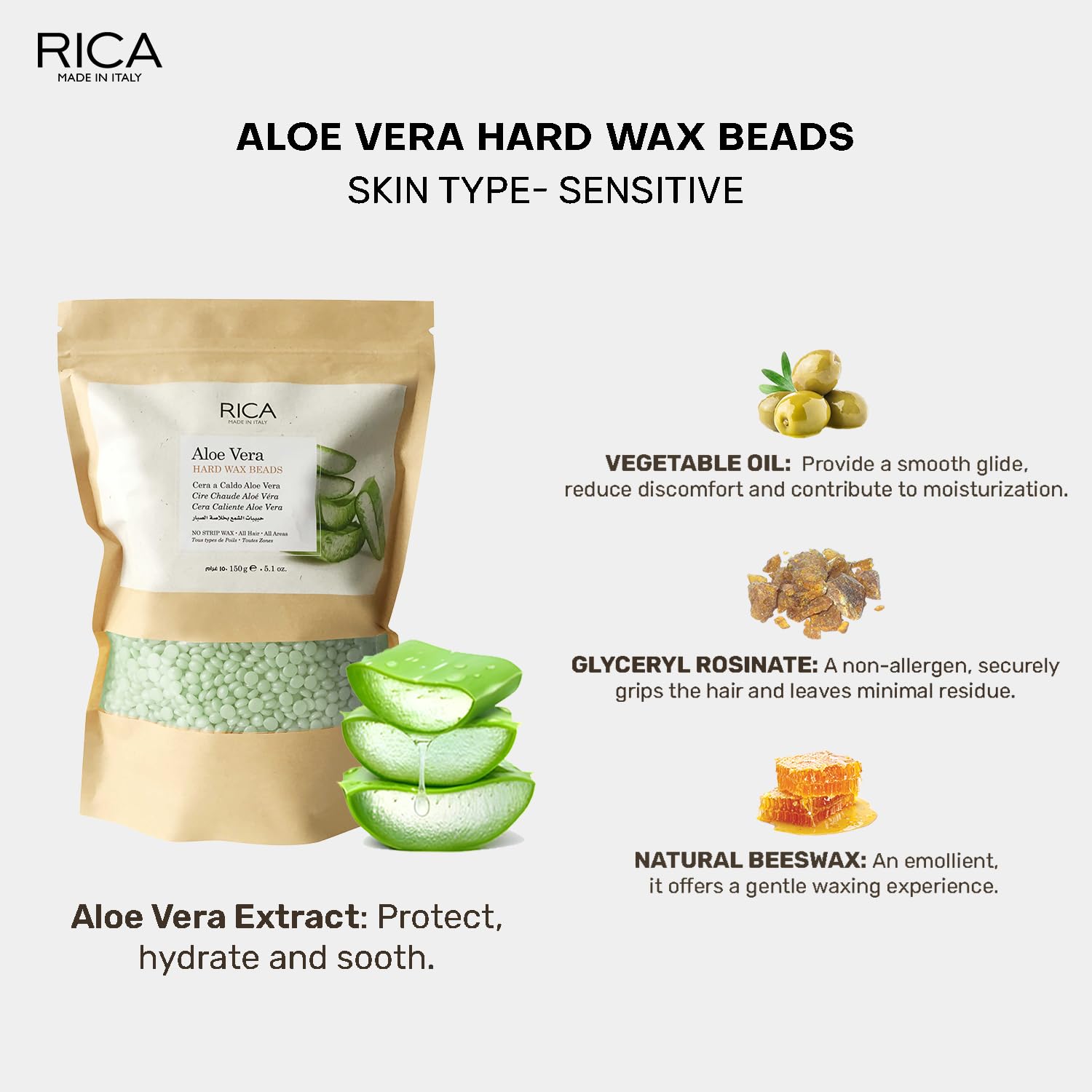 Rica Aloe Vera Beads Wax contains Aloe Vera extracts which have lentative and soothing properties that result in extremely soft skin. Rica Beads Wax is Soft Gentle but Strong and Suitable for even the most sensitive skin. It is used in thin layers compared to traditional hard wax and works at low temperatures. The wax hardens after application once its cooled thus allowing easy removal with fingers. No cloth or paper is required. Rica Wax range guarantees a superior hair removal without irritation and allergens. Rica Wax is gentle to the skin thanks to the natural Patented Formula that contains Glyceryl Rosinate Vegetable Oil Titanium Dioxide Natural Beeswax Zinc Oxide. All Rica products are Made in Italy.