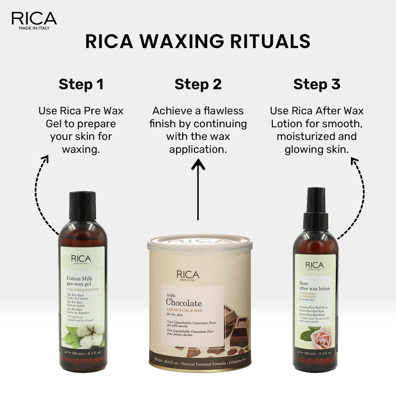 Quantity: - Rica Dark Chocolate Wax 800 ML Rica Lemon after wax lotion 250 ML Rica Cotton Milk pre wax gel 250 ML