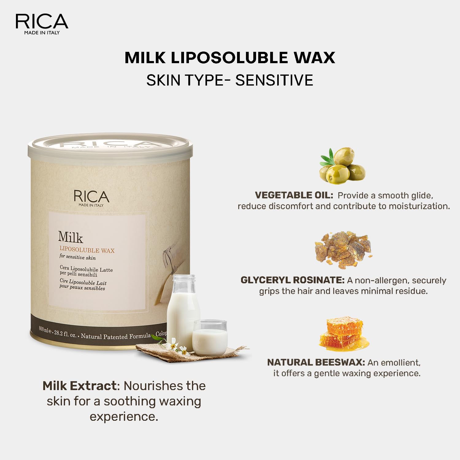 HomeBeautyBodyShaving & Hair RemovalRica Milk Liposoluble Painless Hair Removal Wax For Men & Women|Quick & Easy Tan Removal Waxing for Sensitive Skin| 800 ml Pack of 1