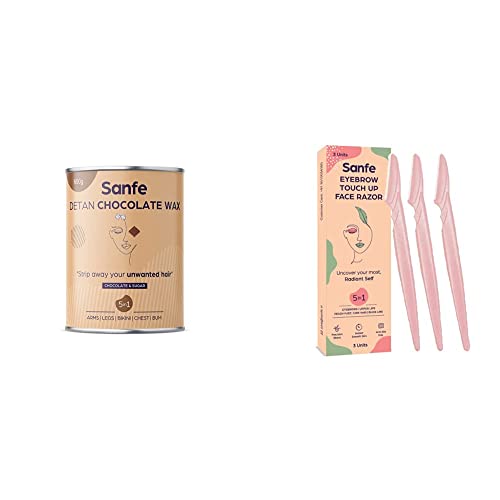 Sanfe Detan Chocolate Wax for Smooth Hair Removal - 600gm with chocolate extracts | For all skin types | Removes Tan Dead Skin | For Arms Legs and Full bodyTaking out tough body hair should not be tough on skin! Strip away your unwanted hair painlessly with Sanfe Detan Chocolate Wax! Enriched with a delicious blend of chocolate and sugar this wax gets rid of thick hair from the roots and also removes tan and dullness on skin. It plays the role of a 5 in 1 hair removal solution - it gets rid of unwanted hair from the arms legs bikini area chest and even the bum.Sanfe Reusable Eyebrow Touch Up Hair Removing Face Razor For Women - Pack of 3 | Instant & Painless Hair Removal |Suitable For Eyebrow Upper lip Chin |Peach Fuzz | Stainless Steel Blade & Firm GripSanfe eyebrow touch-up razor will make you switch from painful threading to pain-free removal of facial hair. Manufactured with Japanese steel it is comfortable to hold with its anti-slip grip. Precisely removes unwanted hair on eyebrows upper lips sideburns peach fuzz and chin with glide. Its sleek design and protective cap make it comfortable and safe to carry while travelling.Your polished look is just minutes away!