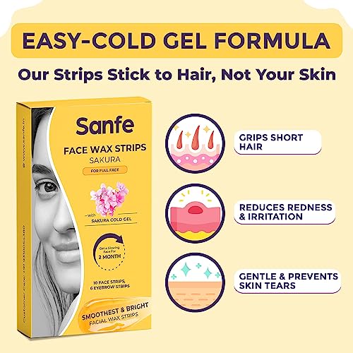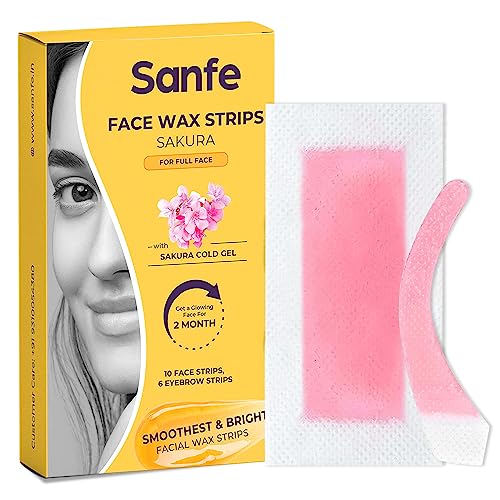 Sanfe Facial Wax Strips Sakura Pack of 16 | Precise Hair Removal For Eyebrows, Upper Lips, Forehead, Chin & Sideburns | Sakura Cold Gel & Glycerin | No Heating Required & Easy To Use Design | For Complete Face Waxing | No Redness & No Burning | Salon Like