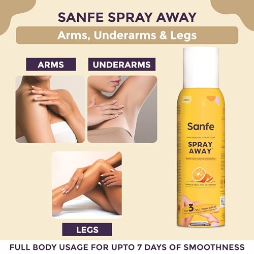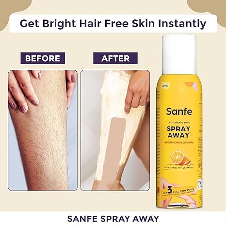 Sanfe Spray Away Hair removal spray is an easy and pain-free way to get rid of unwanted hair from different parts of the body including legs arms underarms and bikini area. They are a convenient and time-saving solution that provides quick results. Unlike other hair removal methods like waxing and epilating hair removal spray is gentle on the skin and does not cause irritation or redness. Additionally it has orange peel extract that also helps to remove tan making the skin appear brighter and smoother. With hair removal sprays you can achieve smooth hair-free and radiant skin in just a matter of minutes. So spray away unwanted body hair without pain!