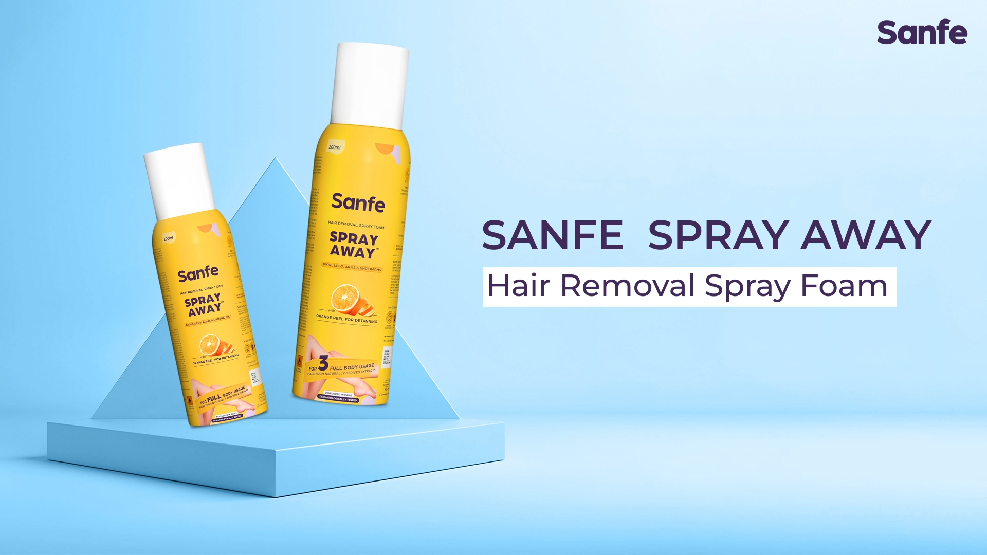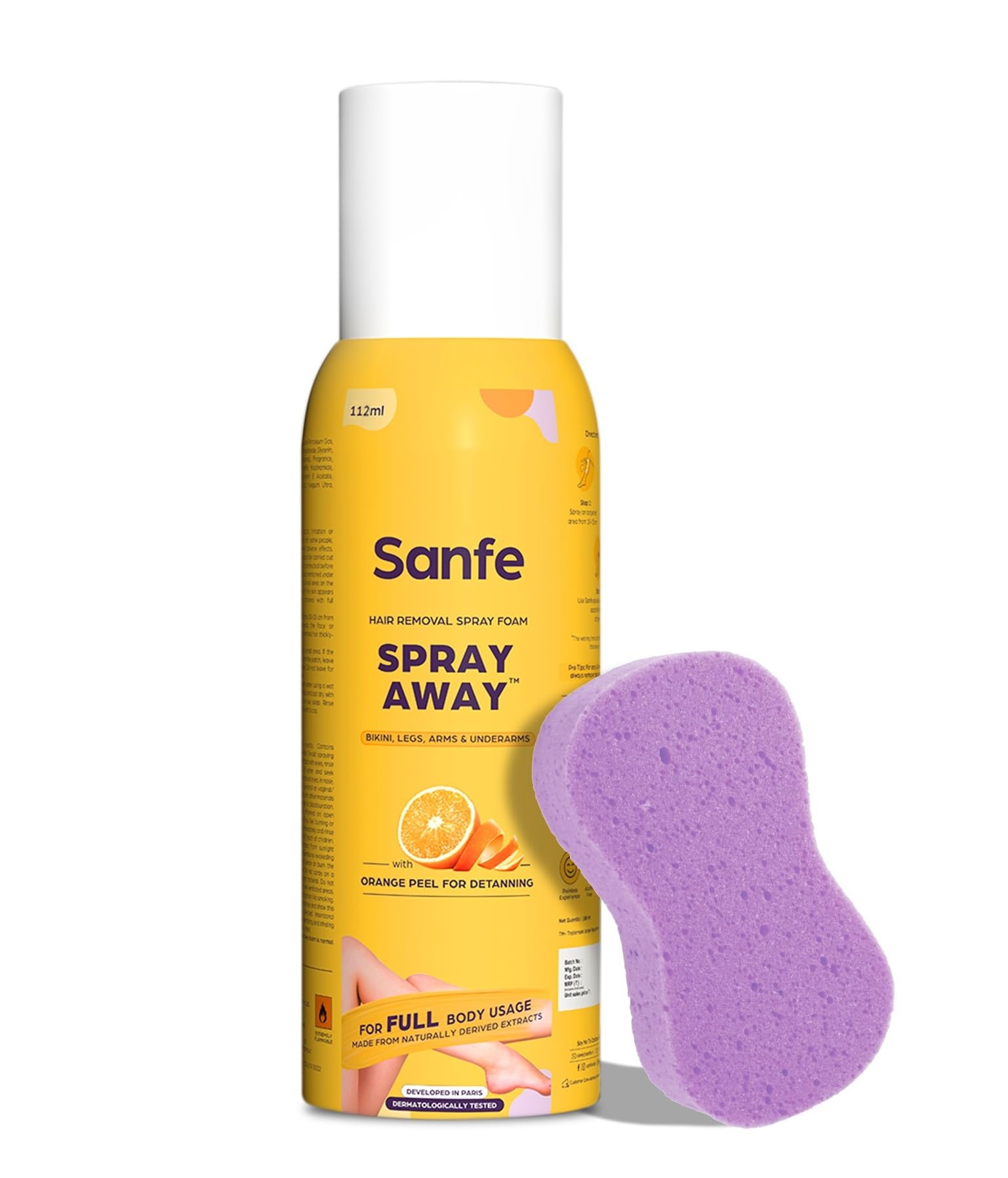 Sanfe Painless & Detan Hair Removal Spray Cream - 112ml | For Chest, Legs, Arms & UnderArm | Removes Hair in 10 Minutes with Skin Detan | Orange Peel, Aloevera, Vitamin E & Niacinamide