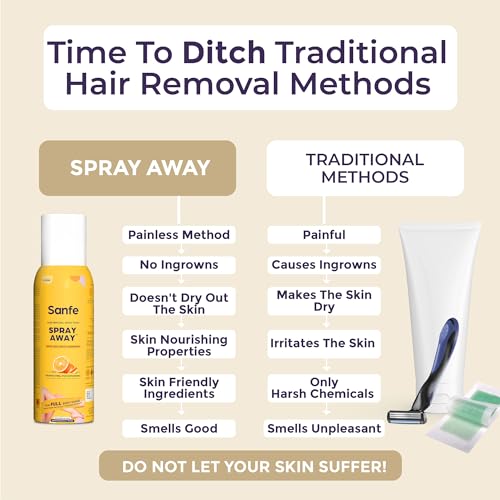 • PAINLESS & CONVENIENT SOLUTION FOR LEGS ARMS & UNDERARMS HAIR: Sanfe Spray Away is an easy painless and convenient way to get rid of unwanted hair unlike other hair removal methods. It can be used at home or on-the-go making it a time-saving solution for