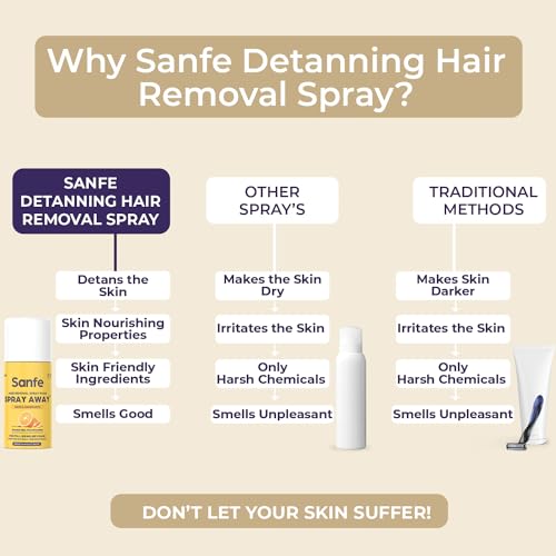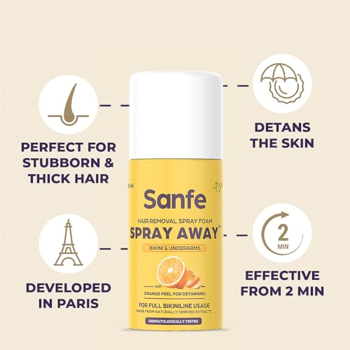 • PAINLESS & CONVENIENT SOLUTION FOR LEGS ARMS & UNDERARMS HAIR: Sanfe Spray Away is an easy painless and convenient way to get rid of unwanted hair unlike other hair removal methods like waxing and epilating. It can be used at home or on-the-go making it a