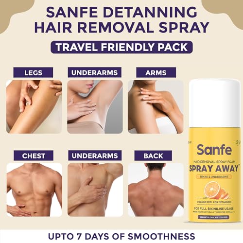 Sanfe Painless & Detan Hair Removal Spray Cream - 25 ml | For Bikini, Chest, Legs, Arms & UnderArm | Removes Hair in 10 Minutes with Skin Detan | Orange Peel, Aloevera, Vitamin E & Niacinamide