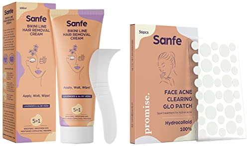 Sanfe Promise Face Acne Patch - Pack of 36 | Pimple Healing Patch | Absorbing Cover |Invisible Blemish Spot Hydrocolloid Skin TreatmentFor pesky pimple emergencies this acne clearing patch is an instant solution to conceal the active pimple under makeup and treat it overnight. Instead of popping pimples put on a pimple patch and forget it. It has a potent solution to soothe acne the easy way. Non-messy and makeup friendly these patches are spot on!Sanfe Hair Removal Cream For Sensitive Skin With Lavender Extracts Vitamin E Aloe Vera Shea Butter With Spatula (Dermatologically Tested) | Bikini Hair Removal Cream For Women and GirlStill using regular hair removers for your intimate area? It's time to switch to Sanfe's Bikini Line Hair Removal Cream which is designed specifically for the delicate skin of the intimate area. Its natural ingredients make it super safe and comfortable to use while the unique formulation delivers the desired results within 5 minutes. The cream not only removes hair but also gently exfoliates dead and dry skin leaving the intimate area brighter smoother and more nourished. The aloe vera extracts maintain the pH balance and the lavender extracts soothe the skin. What's more? This hair removal cream is completely chemical-free and safe for usage on all intimate areas.