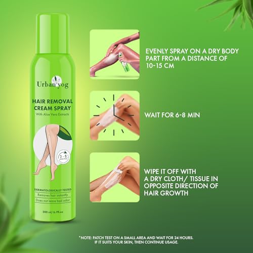 Saves time: This Urban Yog Hair Removal Cream Spray removes body hair in just 6-8 minutes. Spray wait for 6-8 minutes & wipe in the opposite direction of hair growth. Now you donât have to book any prior salon appointments wait for hours to have a hairl