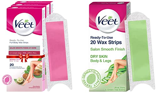 Veet Full Body Waxing Kit Strip For Normal Skin - 20 Strips (Pack of 3)Get the salon-smooth skin and the freedom to wear any look any time with Veet. Veet ready-to-use wax strips is the perfect solution when going to the salon is not an option. These DIY strips effectively pull out as short as 1. 5 mm short hair giving you up to 28 days of lasting smoothness and instantly exfoliated skin at the comfort of your home or on-the-go. Just follow 3 simple steps: Peel-Apply-Pull. These wax strips are great for instant use and do not require heating which means no mess! Use the perfect finishing wipes provided with each pack for easy cleaning post-use. With regular use; get fewer finer and softer hair growing back!Veet Instant Waxing Kit for Dry Skin (20 strips) | Cold Gel Wax Hair Removal for Women | Upto 28 Days of Smoothness | No Wax Heater or Wax Beans RequiredGet the salon-smooth skin and the freedom to wear any look any time with Veet. Veet ready-to-use wax strips is the perfect solution when going to the salon is not an option. These DIY strips effectively pull out as short as 1. 5 mm short hair giving you up to 28 days of lasting smoothness and instantly exfoliated skin at the comfort of your home or on-the-go. Just follow 3 simple steps: Peel-Apply-Pull. These wax strips are great for instant use and do not require heating which means no mess! Use the perfect finishing wipes provided with each pack for easy cleaning post-use. With regular use; get fewer finer and softer hair growing back!