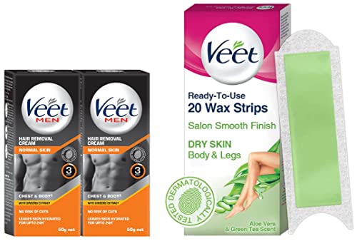 HomeBeautyBodyShaving & Hair RemovalVeet Hair Removal Cream for Men, Normal Skin, 50g Each (Pack of 2), Black & Instant Waxing Kit for Dry Skin, (20 strips)