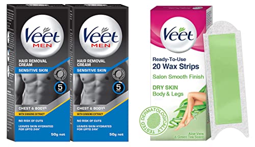 Veet Hair Removal Cream for Men Sensitive Skin 50g Each (Pack of 2) & Instant Waxing Kit for Dry Skin (20 strips)