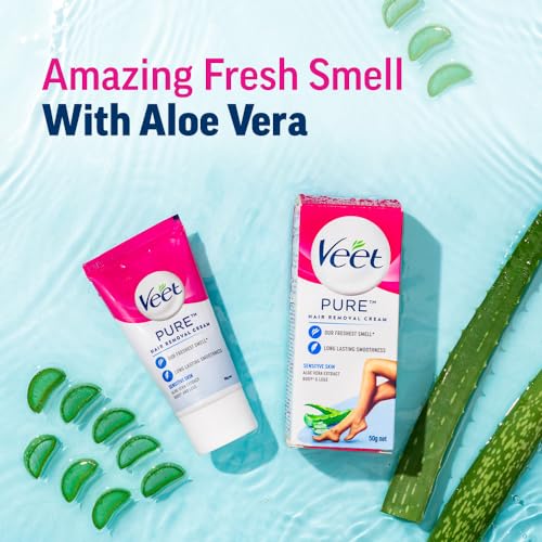 Get the smooth skin and the freedom to wear any look any time with Veet. Veet Pure Hair Removal Cream for Sensitive Skin enriched with Aloe Vera is the right solution when going to the salon is not an option. It effectively removes even short stubborn hair and leaves skin moisturized for up to 24 hours*. It can be used on legs arms bikini line and underarms for a perfectly finished smooth moisturized and exfoliated skin. Veet Pure Hair Removal Cream for Sensitive Skin gives you perfect hair removal results in just 5-10 minutes. Follow the steps mentioned on the pack using the spatula provided. Before using the product please read pack precautions carefully. With regular use; get fewer finer and softer hair growing back!