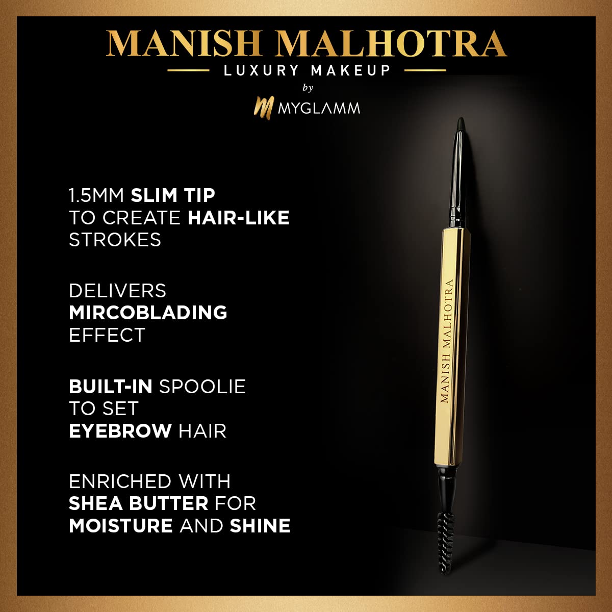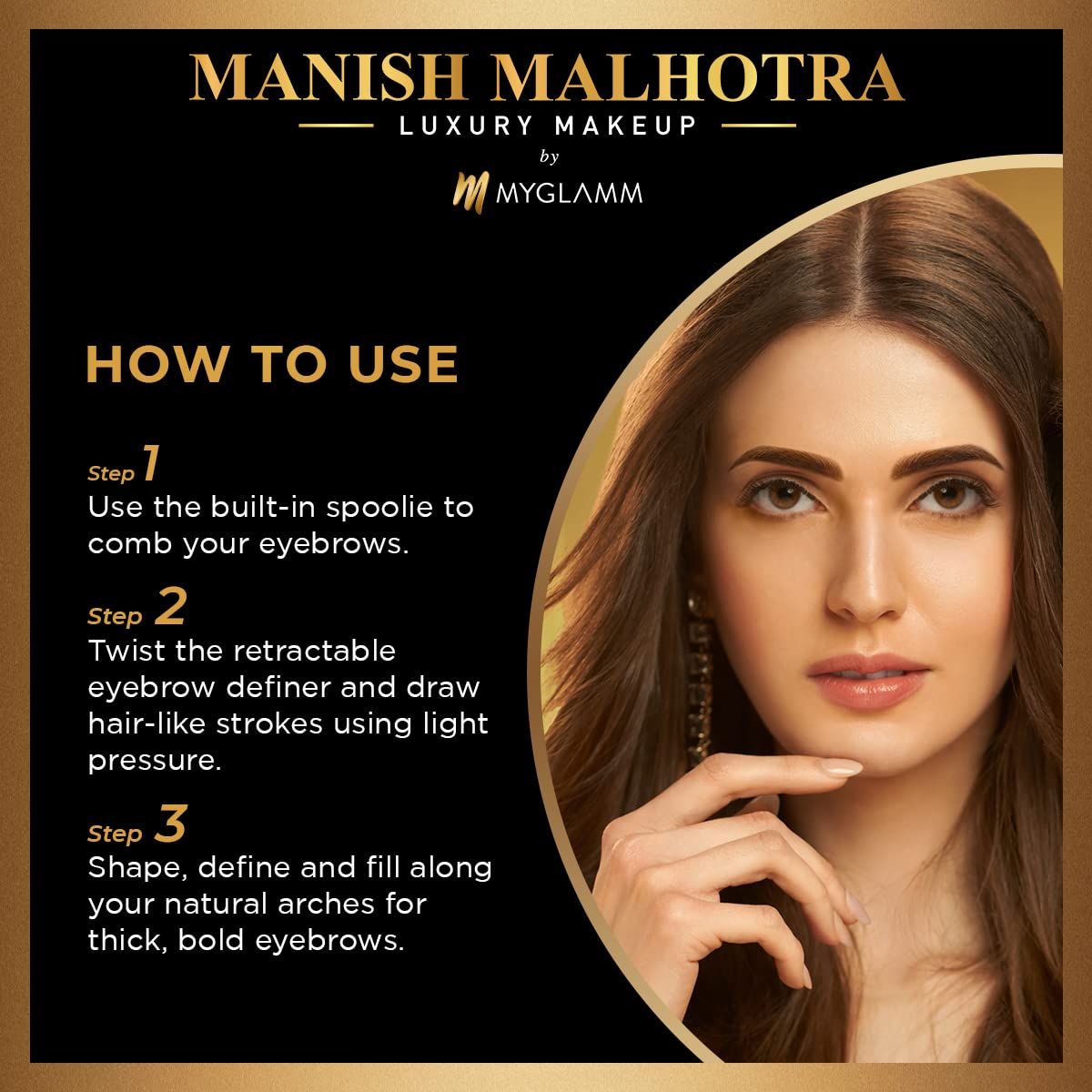 One thing that's common in every celebrity makeup video â thick bold eyebrows. And the way to achieve them? Manish Malhotra Precision Eyebrow Definer. Featuring a 1.5 mm slip tip to effortlessly achieve supermodel-approved bold arches. Enriched with Shea Butter that provides moisture shine and a creamy matte finish. The unique packaging of this brow definer allows optimal control over filling and defining your brows in any desired shape. Its tip can also be used to draw precise hair-like strokes for a microblading-like effect. And the built-in spoolie is the ultimate brow weapon that you can use for grooming and blending. So draw on and own every occasion like a star.