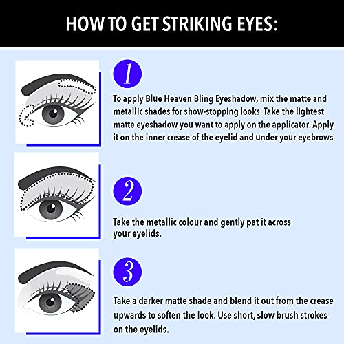 Blue Heaven Bling Matte and Metallic palette is a 12-IN-1 eyeshadow palette with matte and metallic shades. This palette will add instant glamour to your look and take it from day to night in just a few strokes. The shades are buttery soft and glide on the eyelids creating a smooth non-patchy eyeshadow look. Creating fun young smokey and colourful looks has never been easier - with this must-have palette!