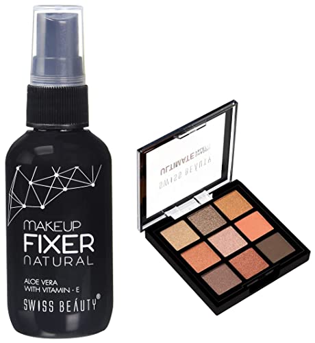 Swiss Beauty Long lasting Misty Finish Professional Makeup Fixer Spray for Face makeup | With Aloe Vera and Vitamin- E | Light weight quick dry makeup Setting spray |70 ML|Makeup fixer used either before or after makeup is to set your makeup so that it can stay longer and not be wiped off with touch of hands or run off with perspiration. Spray from a distance and let it dry before applying makeup or to set makeup or to set makeup spray after applying makeup.Swiss Beauty Ultimate 9 Pigmented colors Eyeshadow Palette| Long wearing and Easily Blendable Eye makeup Palette | Matte Shimmers and Metallic | Multicolor - 03 6gm |Swiss Beauty absolutely new product It is a combination of matte semi-matte and shimmering eyeshadows. Light weight long wear smooth and easy to blend create a new sultry look every day ranging from a nature look to a more sultry evening look these colour tones are highly blendable with an amazing texture that is universally flattering and looks natural on all skin types The palette enables you to choose either a matte or shimmer look for your eyes. These mineral-based eye shadows are so smooth in texture that they are good for contouring eyes and creating multi-dimensional looks.