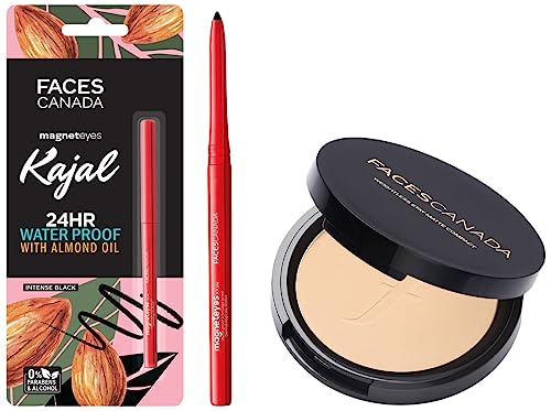 Faces Canada Weightless Stay Matte Compact Vitamin E & Shea Butter Spf 20 Natural 02 9 g#Beautifulbeginswithyou it protects and perfects at the same time. A compact powder formulated with SPF 200 pa+++ to give round-the-clock sun protection against harmful UVA & UVB sun rays. The right blend of pacifying agents with vitamin e & shea butter ensure the compact melts effortlessly into the skin and leaves it looking fresh and hydrated. This synergy coupled with the dual UVA and UVB sun protection action makes this a product which can be used everyday for a healthy and radiant skin. Ingredient story: shea butter: an anti-inflammatory with healing properties shea butter acts as a natural moisturizer and is known for its ability to condition tone and soothe the skin vitamin e: an anti-oxidant which combats the effects of free radicals and improves cell function and skin health. Shade specifications: 1. Ivory 01 2. Natural 02 3. Beige 03 4. Sand 04 know your skin tone: 1. Natural/ ivory: people who fall in this category appear pink or beige skin tone. If you look under your wrist your veins are mostly blue which denotes cool undertone. 2. Natural/sand/beige: people who fall in this category have slightly green brown skin tone/neutral undertone. If you look under your wrist your veins are a mix of blue and green. 3. Ivory/sand: people who fall in this category are dominantly yellow or golden skin tone. If you look under your wrist your veins are mostly green with warm undertone.Faces Canada Magnet Eyes Kajal Waterproof 24hrs Long Stay Smudgeproof Fadeproof Almond Oil & Vit E enriched One Stroke Smooth Glide Black 0.35gThis new kajal is made with a unique smudge and fade proof formula is transfer resistant and keeps you stunning all day. Super soft and easy to apply this alluring kohl is loaded with antioxidants and minerals and is completely free of paraben.