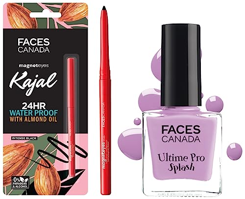 FACESCANADA Magneteyes Kajal - Black 0.35 g | 24 Hr Long Stay | One Stroke Smooth Glide | Waterproof Smudgeproof & Fadeproof | Deep Matte Finish | Enriched With Almond Oil & Vitamin E Matte FinishThis new kajal is made with a unique smudge and fade proof formula is transfer resistant and keeps you stunning all day. Super soft and easy to apply this alluring kohl is loaded with antioxidants and minerals and is completely free of paraben.FACESCANADA Viola 41 Quick Drying Glossy Finish Long Lasting No Chip Formula High Shine Nail Polish For Women Smooth Application No Harmful Chemicals 8 MlGet this long lasting nail polish for you. This one is ideal for nail polish lovers. Organic : No