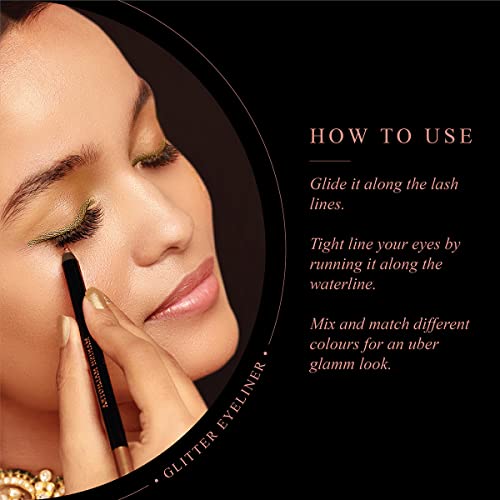 Galaxy Blue is a deep blue shade that goes well with any night out. It is also PETA approved cruelty-free and vegan. A little glitter and a whole lot of glam! The manish malhotra glitter eyeliner by myglamm is a smooth waterproof and Transfer-proof pencil eyeliner. It's versatile enough to create everything from a fashion-forward graphic winged liner to a sultry smokey eye. Made to last all night long this glitter eyeliner works equally well with your lbd or your lehenga.