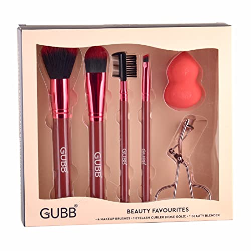 GUBB Beauty Surprise Kit | 4 Makeup Brushes - Powder, Foundation, Eyeliner & Eyebrow Brush | Beauty Blender | Eyelash Curler