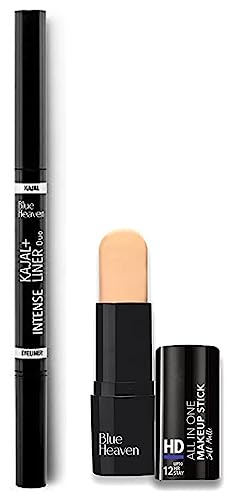 Blue Heaven Intense Duo Kajal + Eyeliner Black(0.55ml+0.30gm)Kajal and eye liner comes in felt tip sketch & retractable type pen waterpoof smudge proof long lasting stays up to 12 hours matte finish. Kajal + eyeliner in 1.Blue Heaven HD All In One Makeup Stick Silk Matte - 101 Vanilla-Very Fair 10gmBlue Heaven HD All-in-One Makeup Stick is the ultimate multi-utility makeup solution. Use it as a foundation to get the perfect base concealer to blur imperfections colour correct to correct undertones and contour to highlight your favourite features. Available in 6 shades to match every Indian skin-tone. Easy to carry and easy on the pocket too.