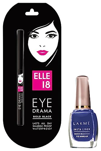 Elle 18 Eye Drama Kajal,Liquid, Bold Black, 0.35G And Lakme Insta Eye Liner, Blue, 9 Ml - Matte Finish