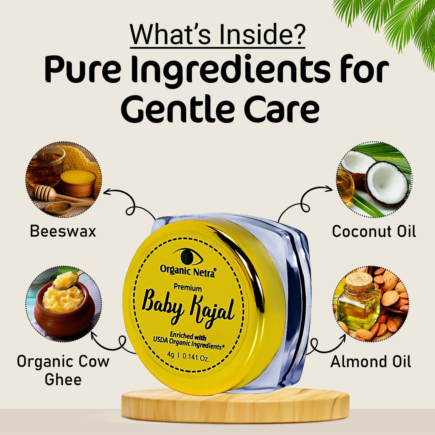 USDA Certified Organic Ingredients: Infused with a nourishing blend of organic Coconut Oil Almond Oil Castor Oil Bhimdeni Kapur Beeswax and Organic Cow Ghee to gently protect and nourish your baby delicate eyes with a natural formula.