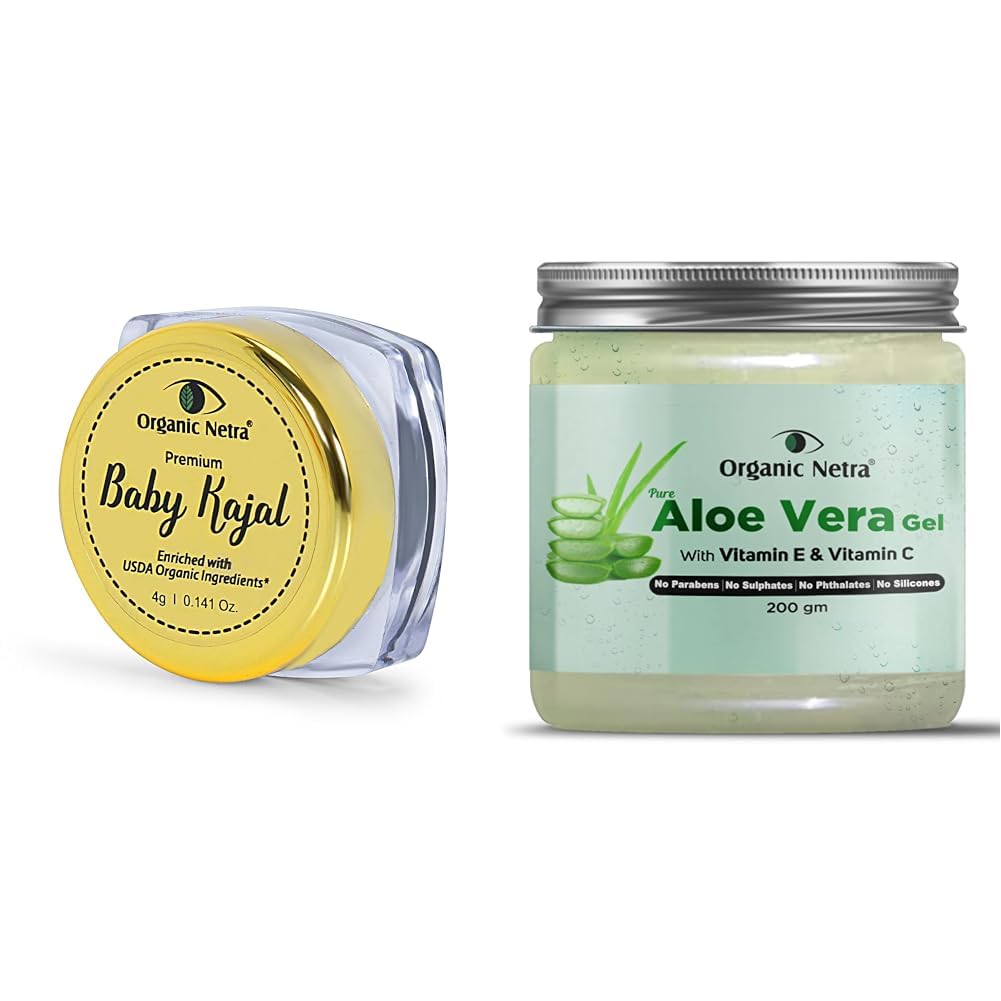 Organic Netra Baby Kajal Water Resistant Smudgeproof Longlasting For Normal Skin Type Enriched With Natural & Organic Ingredients With No Harmful Chemicals Matte Finish 4gA Kajal made with absolute love and care for your tiny totes. Enhance your baby charm with 100% Natural and Organic ingredients safe for the eyes and skin of your baby. What Inside: Coconut Oil Almond Oil Castor Oil Bhimdeni Kapur Bees Wax Organic Cow ghee USDA Certified Organic Ingredients such as Coconut Oil Almond Oil Castor Oil Bhimdeni Kapur BeesWax and Organic Cow ghee.Organic Netra Pure Aloe Vera Gel with Vitamin C & E for Skin Face and Hair | Helps to Repair and Smoothens Hair | Relax and Renew your Skin and Scalp |Paraben Free & Sulphate Free - 200 GmOrganic Netra Aloe Vera Gel is sourced from the succulent natural originally grown aloe vera plant and ensures super high quality aloe vera gel with 0% Paraben 0% Silicone Hexane-free Non-GMO No Sulfates No Phthalates No Mineral Oils and extracted by cold-pressed technology make this the best aloe vera gel for skin and hair and Enriched with Vitamins C & E. Natural Aloe Vera Gel leaves your skin smooth silky and hydrated.