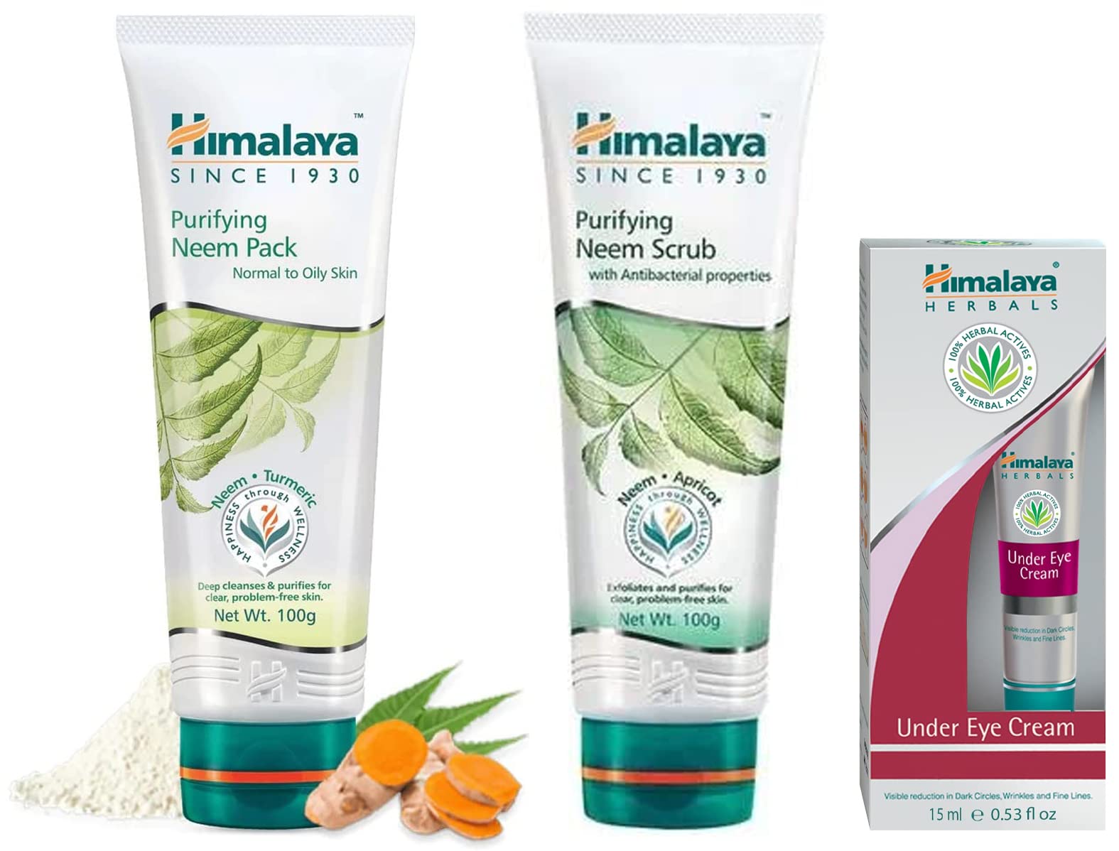 Himalaya Herbals Under Eye Cream 15mlHimalaya Under Eye Cream clears under eye circles pigmentation and blemishes. It also brightens and smoothens the areas around your eyes reduces dark circles by 80 percent in just 4 weeks reduces under eye wrinkles and fine lines by 28 percent in just 4 weeks brightens and smoothens eye contour. Preventing the formation of dark circles is vital to retaining a fresh face. With the help of Himalaya Herbals Under Eye Cream you can protect the delicate skin around your eyes with its proven and safe herbal ingredients. This under-eye cream comes with breakthrough herbal ingredients of Bergenia Ligulata and Cipadessa Baccifera which actively fight against the appearance of dark circles and shield the sensitive skin around your eyes from harsh sunlight. Your skin must be free of toxins and be moisturised to sustain a healthier look without wrinkles and fine lines. Himalaya Eye Cream detoxifies and moisturises your skin thereby rejuvenating your eyes. Consistent use of this cream can make your eyes stay wrinkle free and youthful. The use of this product can result in 80% reduction of dark circles and 28% reduction of under-eye wrinkles and fine lines within four weeks. To attain glowing eye contours Himalaya Herbals Under Eye Cream is a good choice. One more ingredient of the cream is Wheatgerm oil. This is rich in Vitamin E which acts as an antioxidant and protector of harmful UV rays. This cream also helps you fight against scaling laxity and puffiness of your eyes. After cleansing your face apply the cream in the delicate skin around your eyes and gently massage it. For best results use it twice a day. Product Features This cream can be used both by men and women. It is suitable for all skin types. It comes with a quantity of 15 ml. Key ingredients are Cipadessa Baccifera Bergenia Ligulata and Wheatgerm oil. It is dermatologically tested non-comedogenic and hypoallergenic. Reduces 80% of dark circles and 28% of under-eye wrinkles in four weeks.Himalaya Purifying Neem Pack 100gPurifying Neem Pack: Clean clear and healthy complexion. What it does: Himalaya's Purifying Neem Pack brings together the goodness of Neem Fuller's Earth and Turmeric which work together to regulate excess oil secretion clean clogged pores and prevent the recurrence of pimples. Key ingredients: Neem Oil and Neem leaves are excellent skin care ingredients. The oil relieves dry skin and soothes itchiness redness and irritation. It also improves general skin health and immunity combating bacterial infections such as acne boils and ulcers. Turmeric has been used as an antiseptic for centuries. The herb also has strong anti-inflammatory properties which soothe your skin gently. It also makes your skin soft and supple. Fuller's Earth is primarily used to lighten the skin. It has cooling and anti-inflammatory properties that remove deep-seated dirt and skin pollutants.Himalaya Herbals Purifying Neem Scrub 100gmCleansing and moisturizing is an essential part of our daily skincare regimen as it helps exfoliate and rejuvenate. But we often fail to realise that our skin requires something more this. The Purifying Neem Scrub from Himalaya is the answer to your need for a complete skin treatment and is sure to bless you with smooth and soft skin. Pollution and dirt cause multiple skin problems such as black heads white heads acne and skin irritability. The dead cells also need to be removed regularly from the skin. Scrubbing is a skincare technique which removes the dead cells black and white heads from our skin. The face scrub is made of Neem and Apricot and the two ingredients work together as great exfoliator and purifier. The apricot granules help in the removal of the dead skin cells. The purifying quality of neem on the other hand prevents acne and dark spots. The scrub also helps remove the excess oil from the skin which is the root cause of acne and black heads. Himalaya is one of the leading Herbal skincare brands in India which is largely recognized in the country and abroad for its quality skin care and herbal beauty products. So people with sensitive skin need not spare a thought on the quality of the scrub. Directions for use : Clean your face properly with a facial wash. Then apply a generous amount of the scrub and massage gently. Scrub well on the areas that are prone to black and white heads such as the nose cheek and chin. But be careful and avoid scrubbing on pimple prone areas and the eye zone. Rinse clearly with water and discover the radiant glow on your skin. Apply once or twice a week for best results.