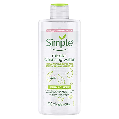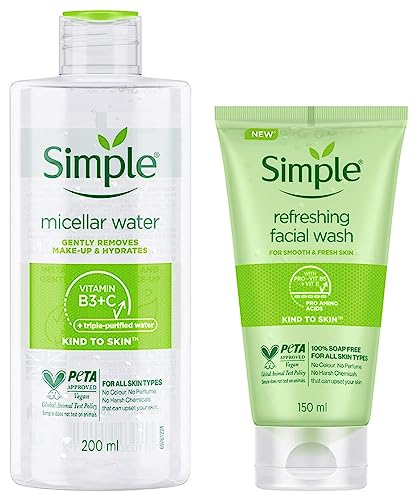 Simple Kind to Skin Micellar Cleansing Water| Makeup Remover For all Skin Types| No Perfume| No Harsh Chemicals & Parabens| No Color| Tested on most Sensitive Skin 200 mlMakeup remover that gives your skin something back? Simple Micellar Cleansing Water is just what you need! It's our most advanced yet gentle facial cleanser to date. It helps remove contaminants known to irritate skin and leaves it clean and fresh. It instantly boosts skin hydration by 90%! With the clever cleansing bubbles i.e. the micelles which attract dirt like magnet and lifts both makeup and impurities from your skin without disrupting your skin's natural barriers. This innovative facial cleanser is made with skin-loving ingredients perfect for all skin types including Vitamin B3 Vitamin C and Triple Purified Water which will give you instant hydration. What more it's the best micellar water for sensitive skin. Our Micellar Cleansing Water like all Simple products contains no colour or dye no soap and no artificial perfume. We're dermatologically tested and approved and ophthalmologically tested. Specially designed for sensitive skin users we're tested and approved hypoallergenic and non-comedogenic At Simple we're all about Clean Beauty with 100% efficacy! And it's really SIMPLE â no skin irritants only skin loving ingredients as we know what we leave out of our products is just as important as what we put in! In fact we only include ingredients that downright love your skin and respect its natural balance and build it further. Because all skin can be sensitive at times; pollution stress irritants changing weather lack of sleep and city living there's a million reasons why your skin can feel a little sensitive and need the extra care and kindness. And we believe Clean Beauty is Simple even for sensitive skin!Simple Kind To Skin Refreshing Facial Wash 150 ml Mild Face Wash with No Harsh Chemicals Soap Free Paraben Free Gentle Cleanser for Sensitive SkinHave oily acne prone sensitive skin? Simple Refreshing Facial Wash is just facewash for your oily skin. This mild facewash thoroughly washes away make-up dirt and other impurities leaving your skin feeling clean fresh and revived. This is the best facewash for oily skin as it's known to remove that extra oil but not dry out your skin. In fact it boosts hydration levels and cleanses gently. Made with skin-loving ingredients it contains Triple Purified Water and vitamins to help replenish and nourish your skin without irritation. Its gentle soap-free formula will make sure you don't dry out your skin. It's a gel formulation known to be the best facewash for sensitive skin. Our Refreshing Facial Wash like all Simple products contains no colour or dye no soap and no artificial perfume. We're dermatologically tested and approved and ophthalmologically tested. Specially designed for sensitive skin users we're tested and approved hypoallergenic and non-comedogenic. At Simple we're all about Clean Beauty with 100% efficacy! And it's really SIMPLE â no skin irritants only skin loving ingredients as we know what we leave out of our products is just as important as what we put in! In fact we only include ingredients that downright love your skin and respect its natural balance and build it further. Because all skin can be sensitive at times; pollution stress irritants changing weather lack of sleep and city living there's a million reasons why your skin can feel a little sensitive and need the extra care and kindness. And we believe Clean Beauty is Simple even for sensitive skin! Aqua Cocamidopropyl Betaine Propylene glycol Hydroxypropyl methyl cellulose Panthenol Tocopheryl Acetate Pantolactone Sodium hydroxide Disodium EDTA Sodium Hydroxymethylglycinate Ingredients correct at time of publishing. Always check product packaging.