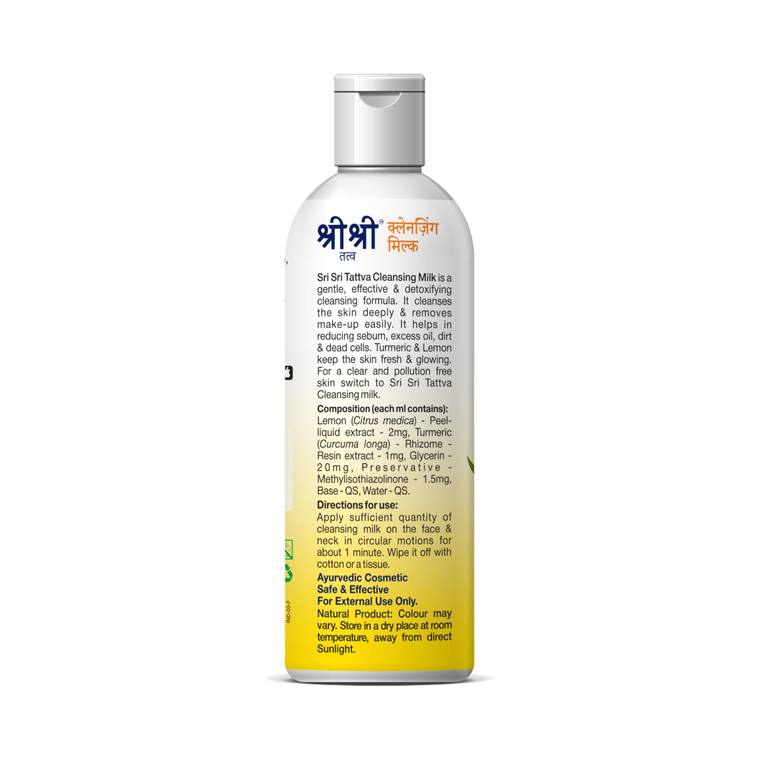 Sri Sri Tattva Cleansing Milk is a gentle effective & detoxifying cleansing formula. It cleanses the skin deeply & removes make-up easily. It helps in reducing sebum excess oil dirt & dead cells. Turmeric & Lemon keeps the skin fresh & glowing. For a clear and pollution free skin switch to Sri Sri Tattva Cleansing milk.