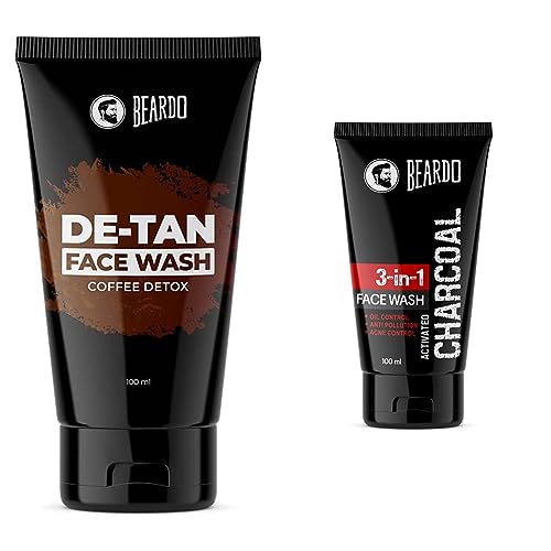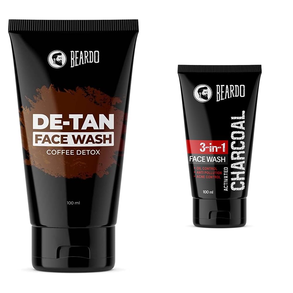 BEARDO De-Tan Face wash for Men 100ml | Reduces Tan for glowing complexion | Coffee Facewash | Dark Spot Reduction | Tan removal face wash menRetain your shade in sun let's face it we cannot avoid the sun. We need to go out in the sun be it for work or travel but the strong sunlight and UV rays can be harsh to our skin and regular exposure to sun and dust can lead to tanning and other skin issues. But as always BEARDO is here to rescue you from the unwanted tan BEARDO De-Tan face wash. Enriched with natural aloe vera extracts and vitamin e this face wash will not only cleanse your skin but will also heal it nourish it and De-Tan it without making it dry. By using this face wash regularly your skin will have a clear and glowing complexion you've always wanted.Beardo Activated Charcoal Anti Pollution Face Wash for Deep Pore Cleaning 100ml | Charcoal face wash for men | Acne face wash for Oily skinBeardo charcoal face wash targets deep-down impurities to defend against daily build-up - like dirt oil and impurities for a truly deep clean. Naturally purifies and deep cleans. Draws out and traps more dirt and impurities than a basic face wash. Provides deeply cleaned tingly-smooth skin. Contains activated charcoal.