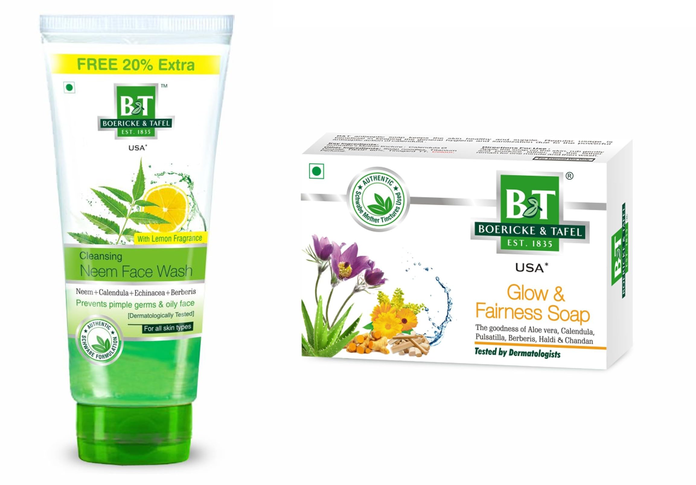 B& T Neem face wash and Glow & Fairness soap makes a perfect combo pack for your daily skin routine. Suitable for all skin types - Oily dry cobmination and normal.