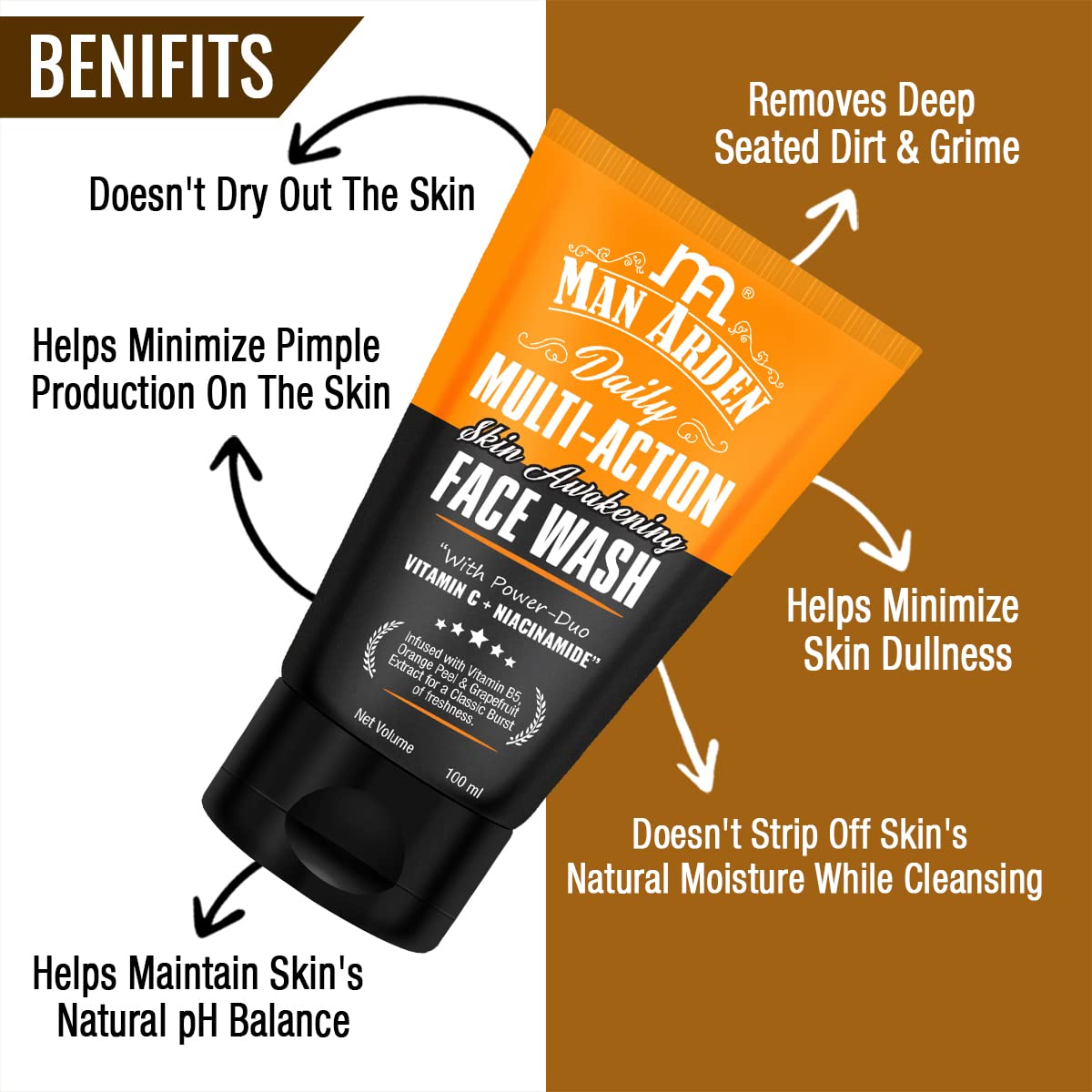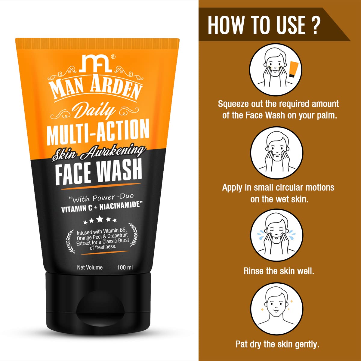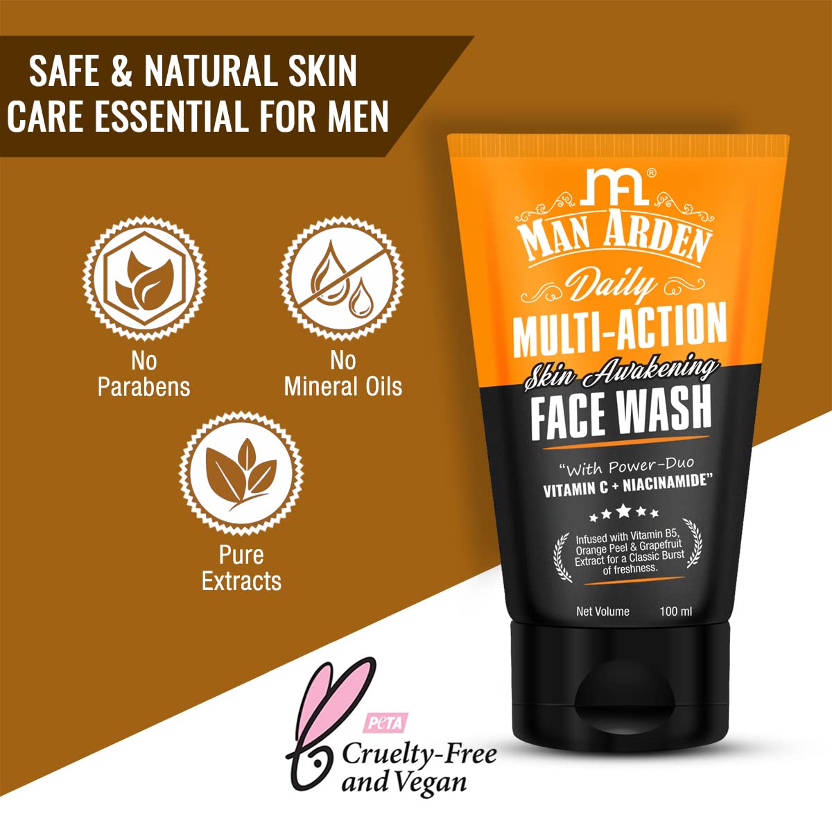 The goodness of natural ingredients: The orange peel and grapefruit extract perfectly blend with the other ingredients of the Man Arden Multi-Action Skin Awakening Face Wash and enhance its functionality. Together they cleanse your skin and prevent aging