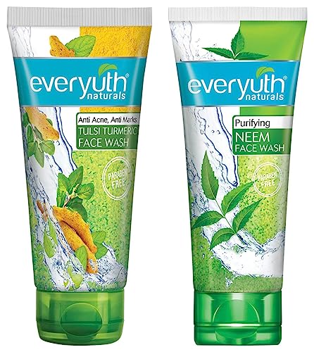 Everyuth Naturals Anti Acne Anti Marks Tulsi Turmeric Face Wash 150gm TubeEveryuth naturals clear beauty tulsi turmeric face wash not only helps prevent pimples but also reduce marks blemishes and dark spots too. It is enriched with the natural goodness of tulsi turmeric brahmi willow bark extracts and tea tree oil which help fight pimples and blemishes. The revolutionary nano active helps regulate sebum production and revitalizes skin cells. Pamper your skin with everyuth naturals face wash to keep it clear glowing pimple free and blemish free.Everyuth Naturals Purifying Neem Face Wash 150gm TubeRegular exposure to heat dust and pollution makes your skin excessively oily and clogs skin pores. This leads to pimples and blackheads. New EverYuth Naturals Purifying Neem Face Wash is enriched with Tea Tree Oil Chamomile and Neem Extract which cleanse your skin and fight against bacterial infections. Its Nano Marine Extracts help in keeping the skin hydrated while Nano Multi-Vitamins help in sebum control and thus give clear healthy and beautiful skin.