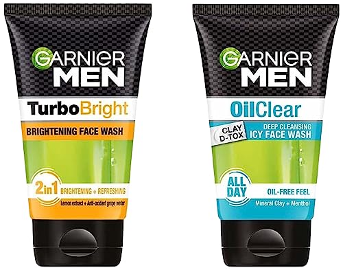 Garnier Men Oil Clear Clay D-Tox Deep Cleansing Icy Face Wash 100gmGarnier Men Oil Clear FaceWash has an intense anti-grease action. It's oil absorbing mineral clay makes skin clean & fresh. Simply massage on wet face & rinse with water. Use twice daily. Garnier Men is India's No. 1 Men's FaceWash Brand* Oil Clear Face Wash SKIN PURIFYING FACE WASH. ALL DAY OIL-FREE FEEL. OIL TRAPPING MUD TEXTURE Oil Clear Skin Purifying Face Wash with Mineral clay & Menthol Garnier Men creates Oil Clear Face Wash: The 1st deep skin purifying face wash for men: It removes excessive oil without drying while ensuring a day-long oil-free feel. Removes excessive oil without drying: Its special oil-trapping mud texture eliminates excessive oil without drying for an intensive anti-grease action. Day-long oil-free feel: Containing cooling Cryo-menthol and oil-absorbing mineral clay it makes skin clean & fresh. It has a day-long oil-free feel. Usage: Apply on wet face gently massage in with fingertips while avoiding the eye contour. Rinse off. Suitable for daily use. Garnier Men is a specific skincare range tailor-made for men with: The proven power of ingredients of natural origin. Fresh and light formulae adapted to menâs skin. Proven efficacy. Products tested and proven on Indian men. FOR BEST RESULTS USE WITH Garnier MEN POWERLIGHT SWEAT + OIL CONTROL MOISTURISERGarnier Men Power White Anti-Dark Cells Fairness Face Wash 100gGarnier Men Fairness FaceWash visbily brightens skin by removing impurities pollutants & dark dead cells . Simply massage on wet face & rinse with water. Use twice daily. Garnier Men is India's No. 1 Men's FaceWash Brand* Brightening Face Wash Garnier presents a face wash for men that not only cleanses but also brightens it to give you a fairer looking skin. The Garnier Men Power Light face wash is an effective cleanser that reveals a fresher brighter looking skin with each use. Formulated for intensive fairness this cleansing face wash is a must-have in your essentials kit no matter where you go. This Garnier face wash for men removes dark cells and pollutants while deeply cleansing the skin of impurities. You'll see a visibly brightened skin each time you have washed your face with the Garnier PowerLight face wash for men. Effective Ingredients for Deep Cleansing The Garnier Men PowerLight face wash has anti-dark cells and anti-impurities ingredients which eliminate dark dead cells and penetrate deep into the skin to clear impurities and pollutants. It also contains micro-polishing beads that effectively exfoliate the skin. The lemon extracts in the Garnier men PowerLight face wash help control excess oil secretion while the antioxidant grape water removes toxins and repairs skin. Experience freshness and brightening effect that comes with the deep cleansing this Garnier mens face wash offers. Apply on wet face gently massage with fingertips in circular movements and wash off. Use this face wash daily to find a new you every time you cleanse your skin. Brand: Garnier Pack Size: 100 g Gender: Men Removes impurities and pollutants Eliminates dark dead cells Gives a brighter appearance by deep cleansing your skin Contains: Micro- polishing beads for exfoliation lemon extracts for oil control and anti-oxidant grape water