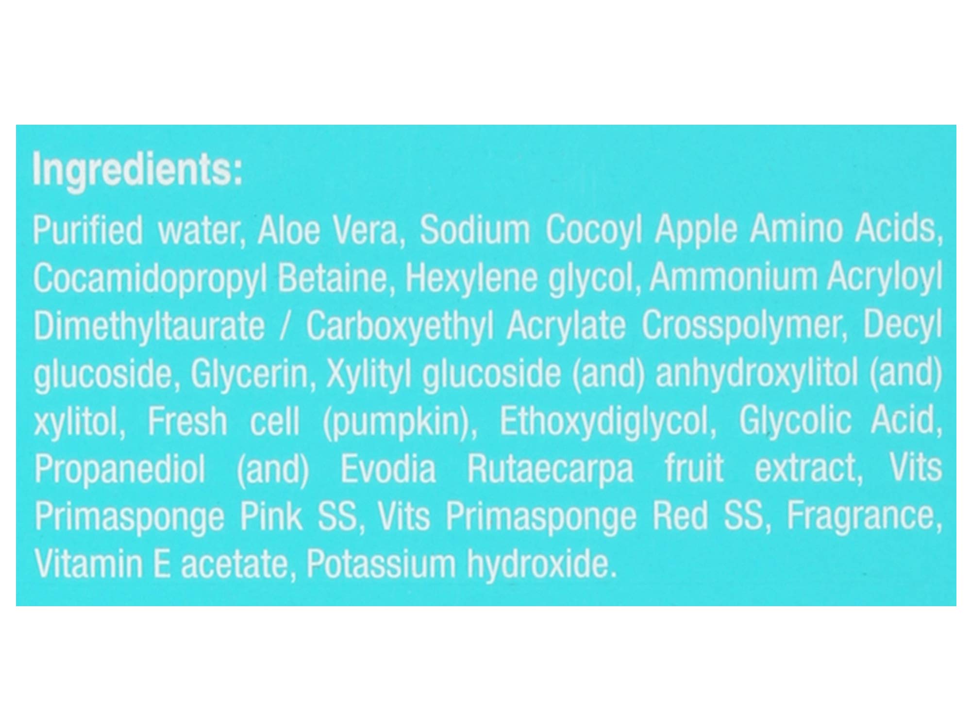 Ingredients - purified water aloe vera sodium cocoyl apple amino acids cocamidopropyl betaine hexylene glycol ammonium acryloyl dimemethyltaurate/carboxyethyl acrylate cross polymer decyl glucoside glycerin xylityl glucoside (and) anhydroxylitol (and) xylitol fresh cell (pumpkin) ethoxydiglycol glycolic acid propanediol (and) evodia rutaecarpa fruit extract vits primasponge pink ss vits primasponge red ss fragrance vitamin e acetate potassium hydroxide.
