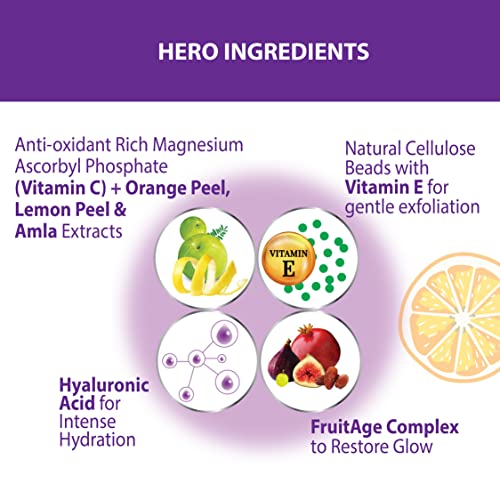 • Natural Cellulose Beads with Vitamin E for gentle exfoliation | Anti-oxidant Rich Magnesium Ascorbyl Phosphate Vitamin C + Orange Peel Lemon Peel & Amla Extracts | Hyaluronic Acid for Intense Hydration | FruitAge Complex to Restore Glow
