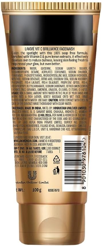 Introducing the Lakme Skin Ultime Collection Vit C Brilliance Facewash with microcrystalline beads. From the house of Lakme – a facewash that is enriched with the power of Vitamin C microcrystalline beads lemon extract and menthol for glowing and refreshed skin wash after wash. Vitamin C also known as the beauty vitamin is a powerhouse of antioxidants which is known to provide a healthy skin barrier that can fight multiple skin problems like ageing pollution & sun damage and dullness of skin. Lakme Skin Ultime Collection Vit C Brilliance Facewash harnesses the power of vitamin C along with the potent ingredients like microcrystalline beads that remove dullness and lemon extract with antioxidant properties is designed to refresh and give a healthy looking glow. Reasons to love this facewash: Easy to apply & rinse Removes dullness and Gently Exfoliates Keeps skin healthy and glowing Enriched with Vitamin C lemon extracts and microcrystalline beads No skin irritation For best results use the Lakme Skin Ultime Collection Vit C serum in the AM and PM routine with Lakme Skin Ultime Collection Vit C Brilliance crème Don’t forget to wear the Lakme Sun Expert Daily Sunscreen before you step out. So that nothing can stop you from being unapologetically you.