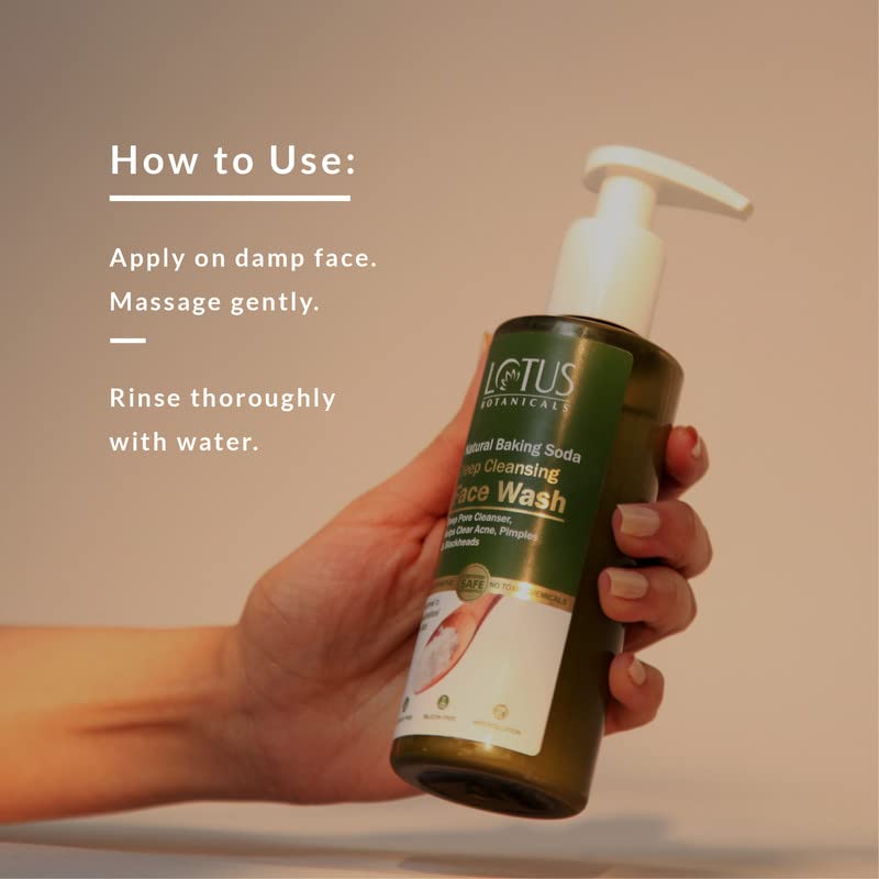 Lotus Botanicals Natural Baking Soda Deep Cleansing Face Wash effectively remove dirt excess oil and even make-up residue giving you a clean balanced and hydrated skin. A perfect detox cleanser removes deep seated dirt and impurities. Certified safe formula maintains skin's natural ph balance and reveals hydrated and squeaky clean skin. Suitable for combination to oily skin type. No Toxic chemicals Preservative Free Paraben Free Silicon Free Sulphate Free Mineral Oil Free Anti-Pollution pH Balanced Cruelty Free 100% Vegan Recyclable