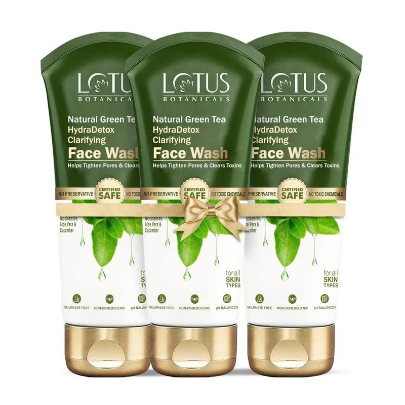 Lotus Botanicals Natural Green Tea HydraDetox Clarifying Face Wash enriched with Niacinamide Aloe Vera Cucumber Witch hazel and Chamomile is the perfect solution to combat acne and pimples tighten pores and reduce inflammation redness and irritation. It brightens and glow your skin and also helps in detoxifying and nourishing your skin as it offers intense hydration and moisture to ensure healthy and plump skin. It further combats fine lines wrinkles and other signs of ageing.