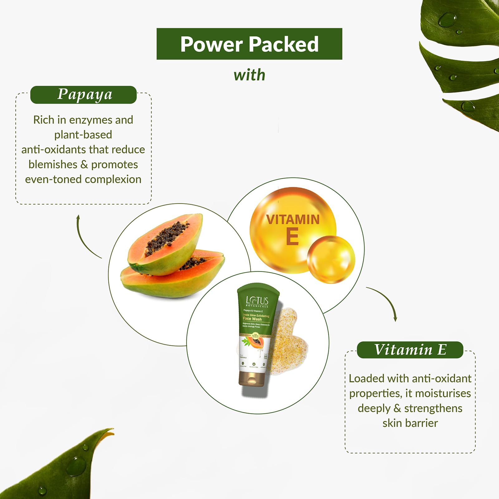 Elevate your skincare routine with the Lotus Botanicals Papaya & Vitamin E Insta Glow Exfoliating Face Wash a synergistic blend of nature's treasures for a revitalized and radiant complexion. Infused with the rejuvenating power of papaya enzymes and the nourishing richness of Vitamin E this exfoliating face wash offers a transformative experience for your skin. Papaya enzymes known for it's natural exfoliating properties delicately slough away dead skin cells and impurities unveiling a fresher and more youthful appearance. Vitamin E's protective properties help shield the skin from environmental stressors while its moisturizing effect replenishes and locks in essential hydration leaving your skin supple and dewy. Experience a rejuvenated glow like never before. Product details Product Dimensions â : â 15 x 5 x 5 cm; 100 g Date First Available â : â 10 August 2023 ASIN â : â B0CFBGXGBP Item model number â : â 50003228 Item Weight â : â 100 g Item Dimensions LxWxH â : â 15 x 5 x 5 Centimeters Net Quantity â : â 100.0 millilitre Best Sellers Rank: #9938 in Beauty (See Top 100 in Beauty) #570 in Face Wash Customer Reviews: 4.3 4.3 out of 5 stars 194 ratings var dpAcrHasRegisteredArcLinkClickAction; P.when('A' 'ready').execute(function(A) { if (dpAcrHasRegisteredArcLinkClickAction !== true) { dpAcrHasRegisteredArcLinkClickAction = true; A.declarative( 'acrLink-click-metrics' 'click' { allowLinkDefault": true } function (event) { if (window.ue) { ue.count("acrLinkClickCount" (ue.count("acrLinkClickCount"),0) + 1); } } ); } }); P.when('A' 'cf').execute(function(A) { A.declarative('acrStarsLink-click-metrics' 'click' { "allowLinkDefault" : true } function(event){ if(window.ue) { ue.count("acrStarsLinkWithPopoverClickCount" (ue.count("acrStarsLinkWithPopoverClickCount"),0) + 1); } }); });
