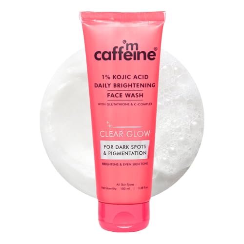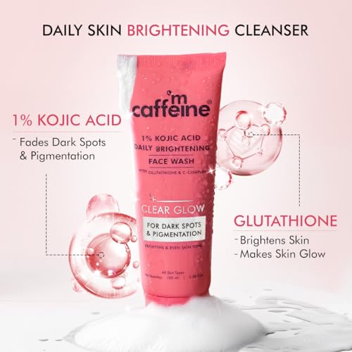 CLEAR GLOW 1% Kojic Acid Daily Brightening Face Wash Cleanses & Brightens Skin | Reduces Dark Spots & Pigmentation | Evens Skin Tone Reveal bright and glowing skin after every wash! Your solution for dull skin is here made with 1% Kojic Acid and Glutathione which helps in fading dark spots pigmentation and leaves your skin hydrated and glowing. It's creamy texture gently cleanses your skin and doesnt feel dry post-wash. It is powered with C-Complex a potent blend of antioxidant-rich Caffeine + Ceramides which repairs UV damage caused by sun exposure. It is non-drying fragrance-free suitable for all skin types and can be used regularly to give your skin a clear glow from within. 89% agree skin felt brighter and achieved even complexion.* 90% agree it cleansed their skin without drying.* 83% agreed face wash lightens pigmentation and dark spots.* 91% felt it soothes & smoothens the skin* *Based on an independent consumer study. Reduces Dark Spots with 1% Kojic Acid 1% Kojic Acid targets pigmentation dark spots scars and uneven skin tone. Bright & Glowing Skin with Glutathione & C-Complex Glutathione & C-Complex(Caffeine & Ceramides combined) Brightens Even Tones & Repair Sun Damaged Skin Non-Drying Fragrance Free Formula for Hydrated Skin This foaming cleanser leaves skin non-drying and hydrated. Consumer Approved 89% agree skin felt brighter and achieved even complexion.* 90% agree it cleansed their skin without drying.* 83% agreed face wash lightens pigmentation and dark spots.* 91% felt it soothes & smoothens the skin* *based on consumer study Good For You Good For The Planet: CLEAR GLOW 1% Kojic Acid Daily Brightening Face Wash is perfect for both women and men. It is PETA Certified and free from Paraben SLS and all other toxic ingredients. This Face Wash is also FDA-approved dermatologically tested and has Zero Plastic Footprint.