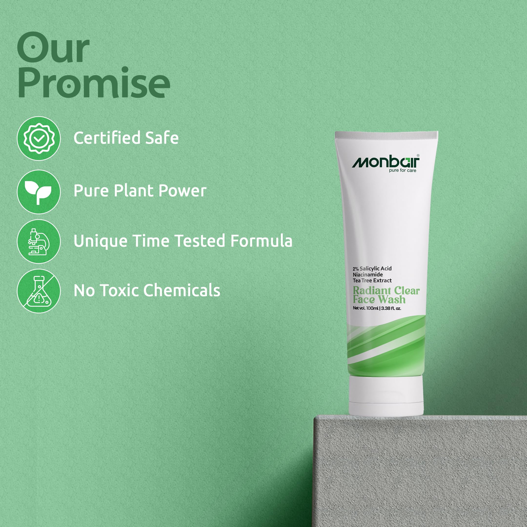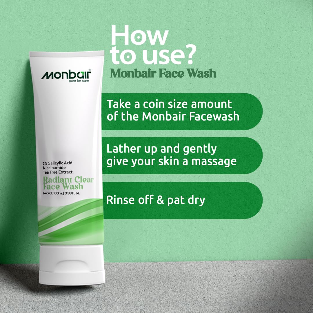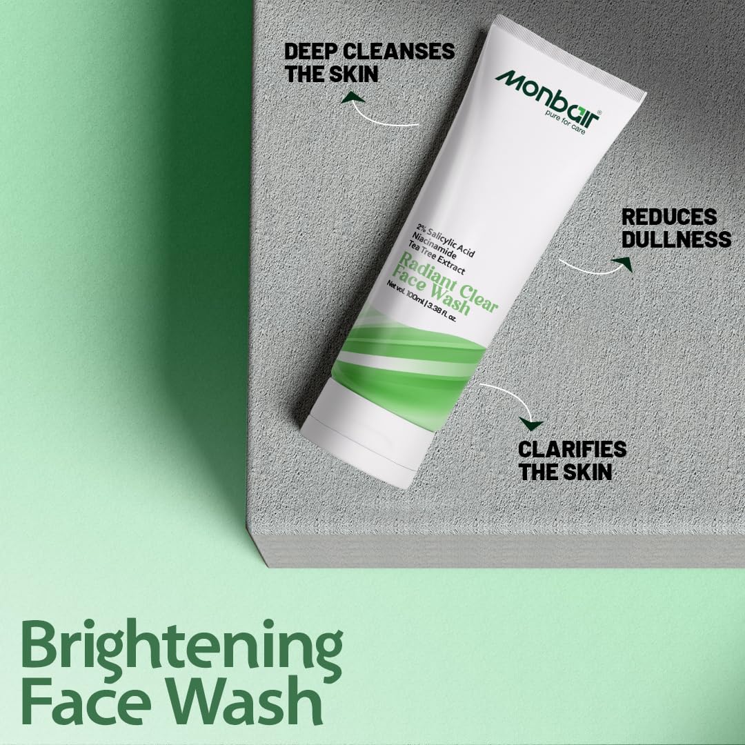 Monbair Radiant Clear Face Wash | 2% Salicylic Acid Niacinamide Tea Tree | Anti-Acne Sulphate-Free | For Oily Skin | 100ml