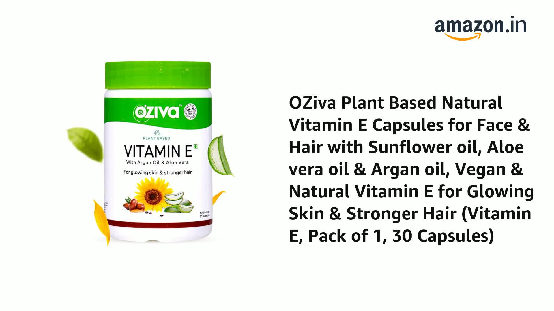 OZiva Plant Based Natural Vitamin E Capsules for Face & Hair with Sunflower oil, Aloe vera oil ,Argan oil, Vegan &Natural Vitamin E for Glowing Skin & Stronger Hair (Vitamin E, Pack of 1, 30 Capsules)