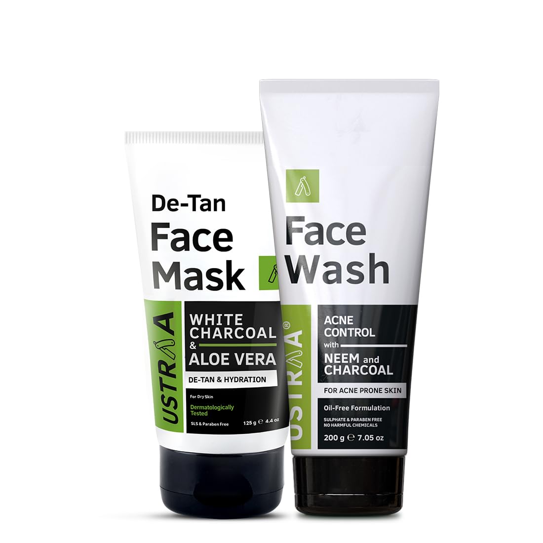 Ustraa De-Tan Face Mask - Dry Skin - 125g - Wash-off mask | Effectively Removes Tan & Pollutants & Face Wash Acne Control - With Neem & Charcoal - 200g - Controls Oil | Prevents Acne