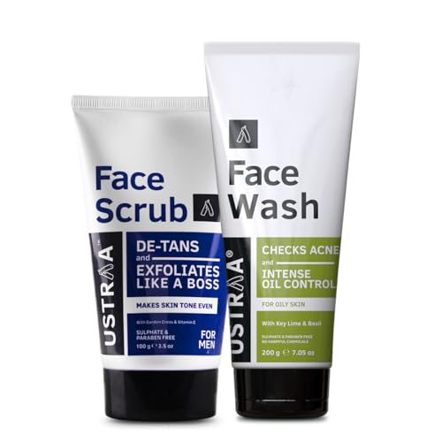 De-tanning and cleansing for oily skin. USTRAA's Face Wash & Scrub combo keeps oil in check and fights the effects of sun & pollution. Face Wash Oily Skin - Specially formulated for bros with oily skin this face wash with Basil and Lime gives you a fresh and oil-free appearance checks acne and controls excess oil on the face. Like all our products this product is completely free of paraben sulphates and other harmful chemicals. Face Scrub De-Tan - For men who spend a lot of time outdoor or sweat it out at the gym this is a must. While a face wash cleans your face the scrub penetrates into the pores of your skin and removes the dead skin. Making the skin healthier. Pollution stress lifestyle that involves eating a lot of junk food smoking or staying up late affects your facial skin health. This ultimately leads to pimples white-heads black heads uneven colour tone and dryness. The Ustraa face scrub helps repair your skin from all that and also de-tanning. With bigger walnut granule sizes it works more efficiently on a man's face as we men have thicker skin.