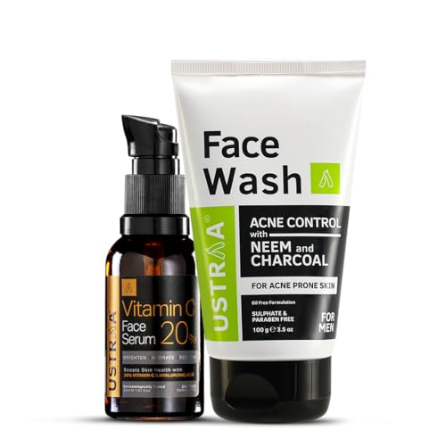 Ustraa Face Wash Acne Control - With Neem & Charcoal - 100g - Oil control, Prevents Acne & 20% Vitamin C Face Serum - 30ml | 20% Vitamin C in Pure form | with Hyaluronic Acid | Anti-Aging, Brightening
